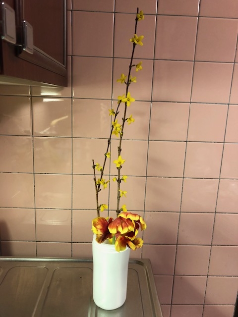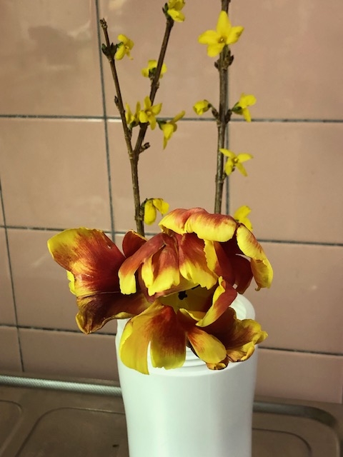 こんな”冬なのに春の日”に、ご近所様より、画像の通り、『変わり種チューリップ&レンギョウ』の花をいただきました♪♪♪