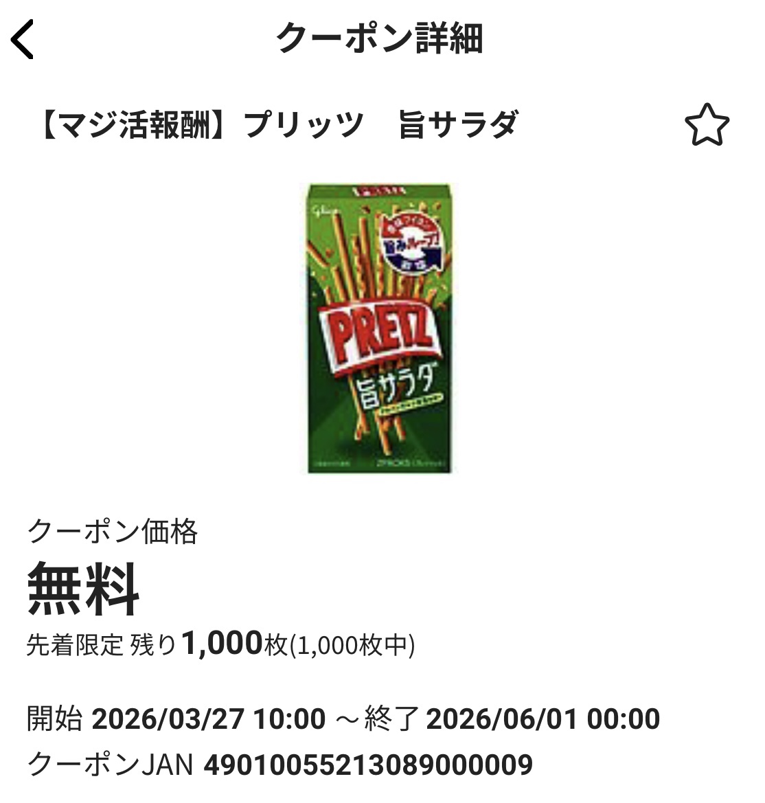 利用を続けていると、maj!caアプリ内のクーポンコーナーに”クーポン価格無料の商品”が出て来て、画像の通り、『PRETZ旨サラダ』をもらうことができましたーー*(^o^)/*\(^o^)/
