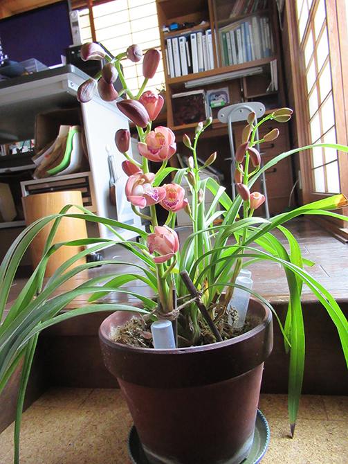 シンピジュウムの花が咲きました。ベランダに出しっぱなしにしている鉢ですが、もう何年も前に見事な鉢植えをいただいてから花が咲かず、気が向いたときに植え替えをしていても花芽が出ず、細々と細い葉だけが生き残っていました。ところが数年前に気がついたら花芽が出ていて、鉢を屋内に取り込んでおいたところ花が咲くようになりました。チョコレート色のおいしそうな花で、結構長く咲き続けます。本当はもっと大事にすれば葉っぱも花との釣り合いがとれて見栄えが良くなるのでしょうが、ベランダに出しておくと水やりを忘れたり思い出したときに液肥を与えたりと、全くのずぼらな育て方をしています。それでも花の咲くのを見ると嬉しくなり、そのときだけは眺めて楽しんでいる勝手な私です。